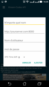 Sur le formulaire, mettez les informations suivantes : Nom : IPTV premium URL du serveur : ht tp://iptvpro.premium-showtv.org:8789 Identifiant : votre-identifiant Mot de passe : votre-mot-de-passe NB : vous trouverez votre mot de passe et votre nom d’utilisateur sur le lien de votre fichier m3u. Exemple : https://iptvpro……./get.p hp?usern ame=votre-identifian t&passwo rd=Votre-mot-de-passe&type=m3u&output=ts Après avoir cliqué sur Ajouter